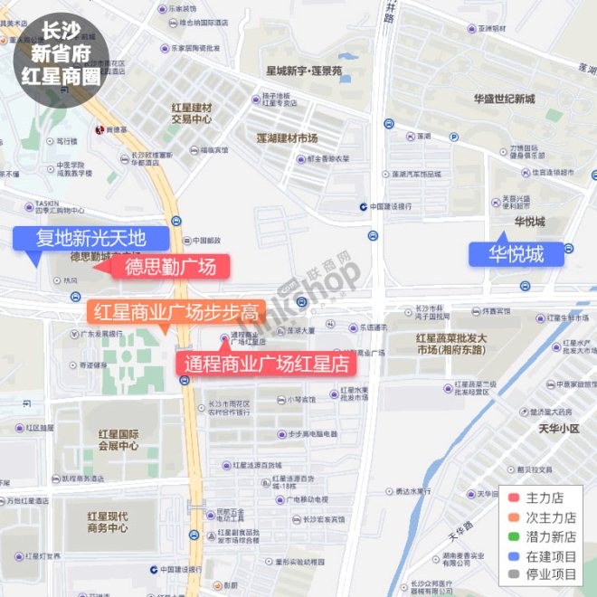 6大次主力店:香港新世界百貨,春天百貨,開福萬達廣場,華遠海信廣場,黃興路步行街,悅薈廣場
