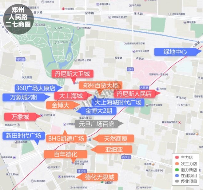 7大次主力店:金博大6億,BHG凱德廣場,百年德化,鄭州百貨大樓,亞細亞,天然商廈,德化無限城。停業(yè)商場:元旦廣場百盛。