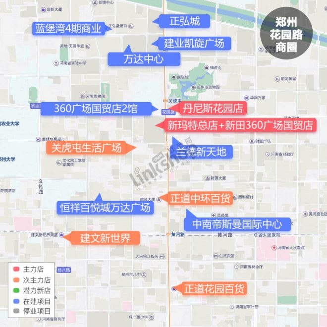 地鐵2號線的開通、農(nóng)業(yè)路高架的通車,為鄭州第二大商圈花園路農(nóng)業(yè)路的升級提供了契機?;▓@路東側(cè)的鄭東新區(qū)商圈由于王府井熙地港、丹尼斯七天地的升級改造、正大世紀城市廣場、寶龍城市廣場扎堆而逐漸對花園路有所影響。隨著百悅城變身萬達,新田投資360廣場國貿(mào)店2館,正弘城,建業(yè)凱旋廣場等大項目相繼進入花園路周邊,鄭州第二商圈的位置得以鞏固。