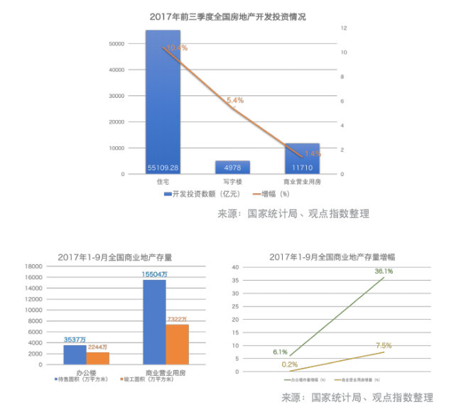 數(shù)據(jù)顯示,2017年前三季度商業(yè)地產(chǎn)的投資熱情尤為高漲。其中全國辦公樓投資4978億元,同比增長5.4%;商業(yè)營業(yè)用房11710億元,同比增長1.4%。