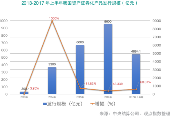 根據(jù)中央結(jié)算公司的數(shù)據(jù)統(tǒng)計,2013-2016年,我國資產(chǎn)證券化發(fā)行額逐年遞增,由2013年300億元上漲至2016年的8600億元,增長近28倍。截至2017年上半年,全國共發(fā)行資產(chǎn)證券化產(chǎn)品4884.1億元,同比增長68.87%,市場存量為14624.78億元,同比增長66.48%。